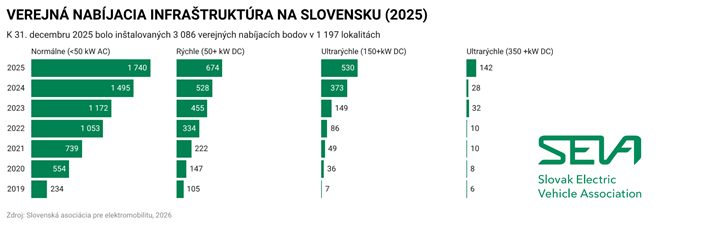 Ku koncu vlaňajška bolo k dispozícii vyše 3000 nabíjacích bodov pre elektrické autá na takmer 1 200 lokalitách, pričom celkový inštalovaný výkon dosiahol 201 MW. Najrýchlejšie pribúdajú vysokovýkonné a ultrarýchle DC stanice, vyplýva zo štatistík asociácie SEVA.Ku koncu roka 2025 bolo na Slovensku dostupných už 3 086 verejných nabíjacích bodov, ktoré umožňujú vodičom nabíjať elektromobily celkovo na 1 197 lokalitách, čo predstavuje medziročný nárast o 27 %, resp. 24 %. Ešte výraznejší posun nastal pri celkovom výkone infraštruktúry: inštalovaný výkon dosiahol 201 MW, teda približne o 61 % viac ako na konci roka 2024 (125 MW).